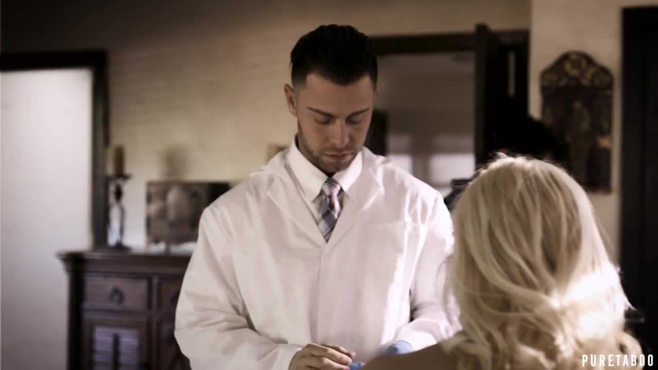 Scene cuts to a car pulling into the driveway. George runs out to greet the doctor, who steps out of his car dressed neatly and wearing a white jacket. George thanks him profusely for coming so quickly and with such discretion. The doctor, very direct and clinical in his speech, cuts George off to ask if he'll assist in bringing his materials inside. George shuts up and they exit the frame in silence. When the doctor enters Kelly's room, with George in tow, Kelly is lying naked in a fetal position. She is very uncomfortable. The Doctor, who introduces himself as Dr. Finch, matter-of-factly asks her to sit up and explain her symptoms while he checks her heart and pressure, puts on gloves and pulled out a bottle of lubricant from his bag. He has her get back on all fours and, asking her permission to touch, lubes up her asshole and slowly slides his fingers in until his is fist-deep and able to pull out each ball. They slowly plop on the bed and he hands them to George, who stares down in disbelief. For some reason, he can't help but feel a bit aroused ... even though he knows he shouldn't.